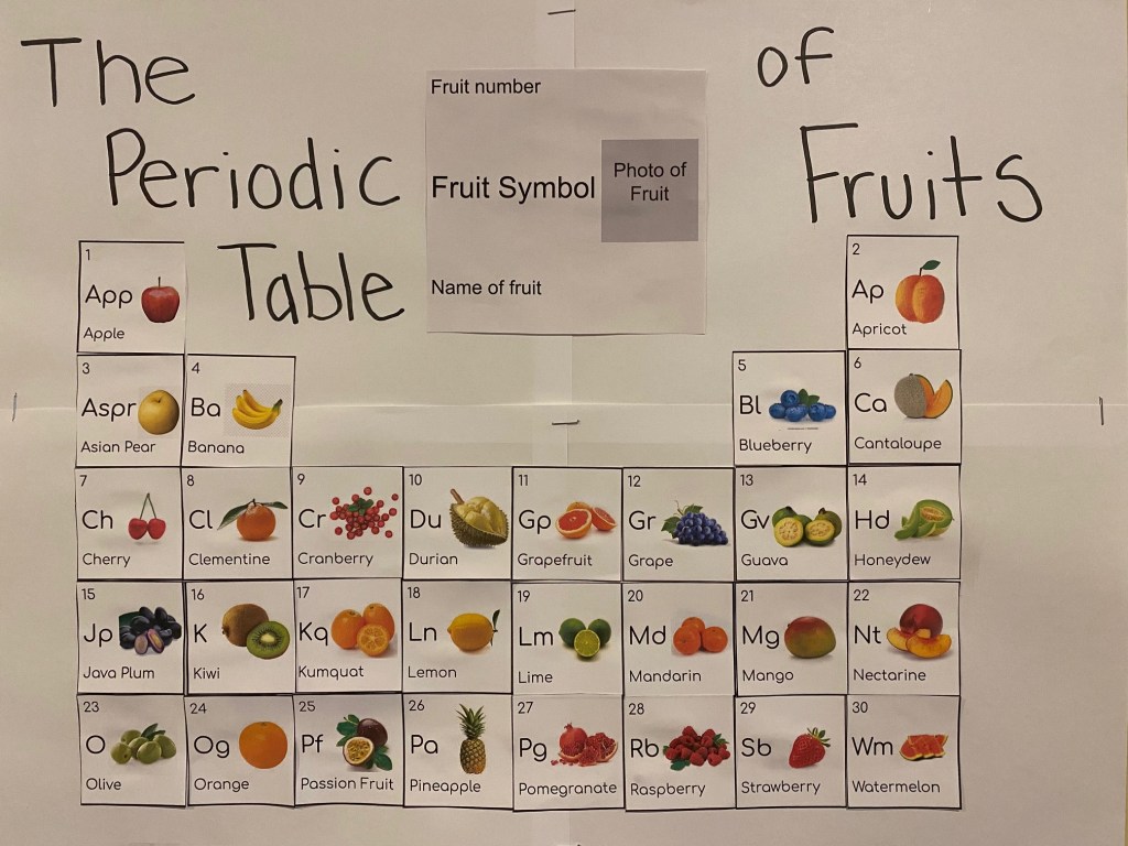 Our next student decided to make a periodic table of fruits! Try to guess the similar property of the fruits in each column! (Columns 3-6 have the same property.)